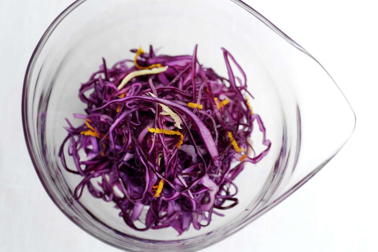 Asiatisk vegofräs i salladsblad med limepicklad rödkål