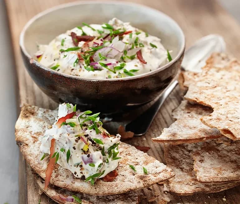 Belgiska grahamsvåfflor med löjrom, syrad grädde och rödlök
