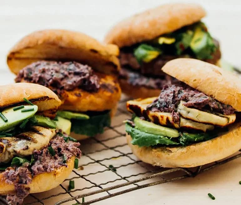 Vegoburgare med karamelliserad rödlök och tryffelmajonnäs