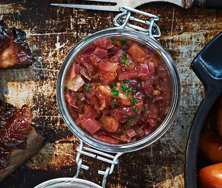 Ugnsbakade lammspjäll och rödlök med kapris- och persiljekräm