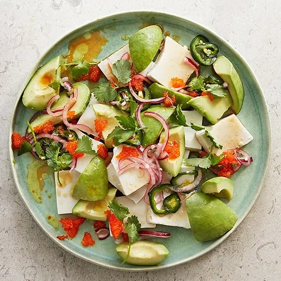 Silkestofu med tångkaviar, koriander och picklad rödlök