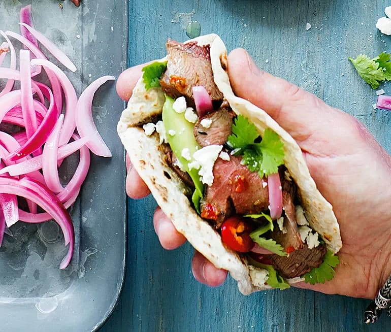 Vegetariska texmexjärpar i wrap med picklad rödlök och chilidressing