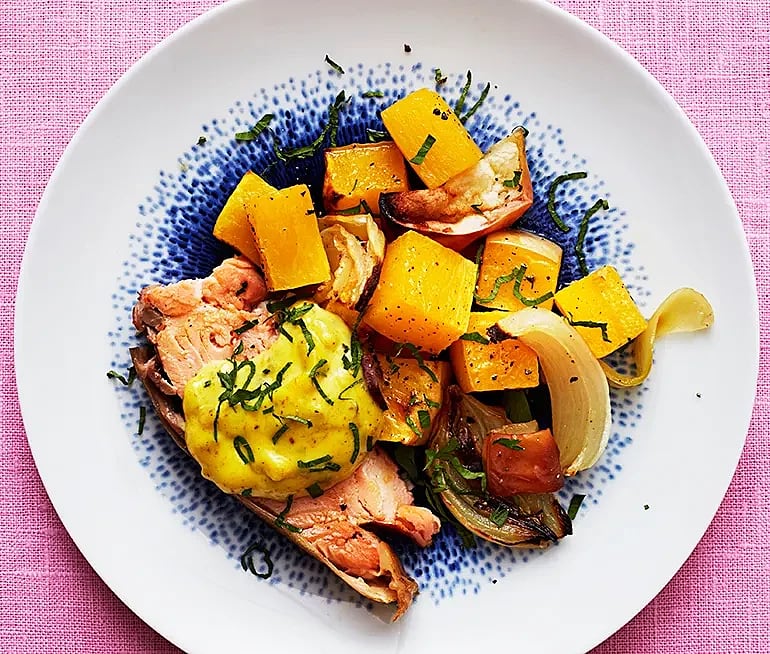 Äppel- och pumpapytt med rökt lax och currymajonnäs