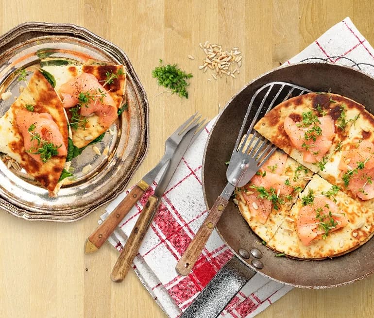 Tunnbrödsquesadilla med pepparrot, spenat och rökt lax