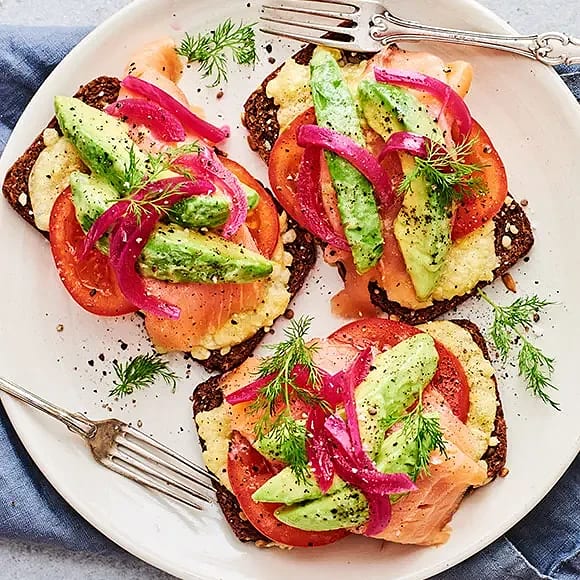 Ostgratinerad smörgås med avokado och rökt lax