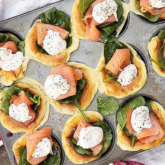 Pannkaksmuffins med rökt lax och smetana