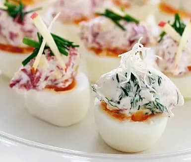 Ägghalvor fyllda med rökt lax och pepparrot eller rökt renstek och äpple