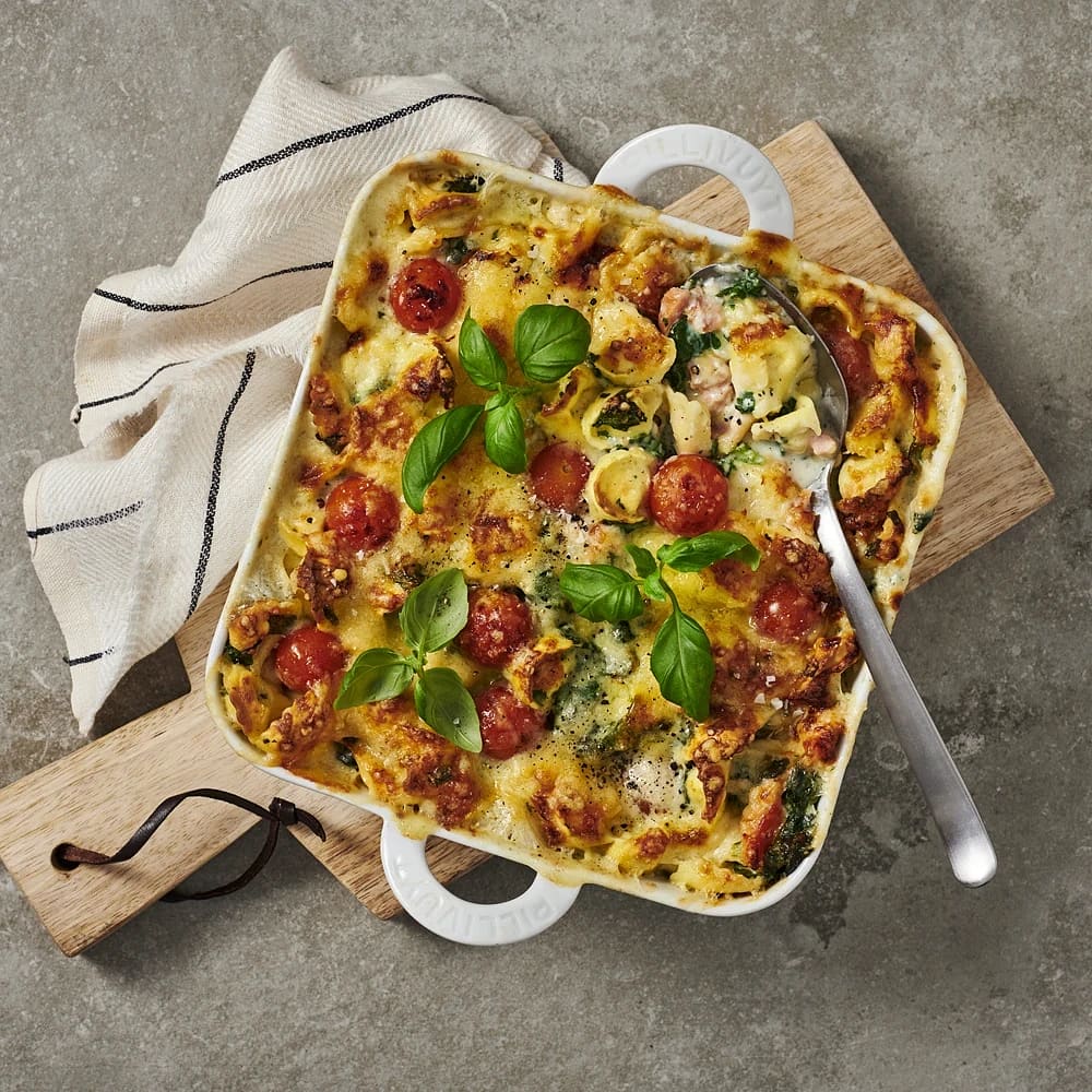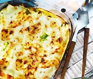 Pastagratäng med rökt lax och spenat