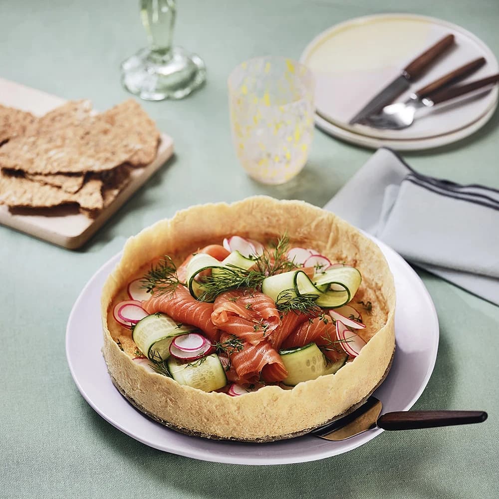Västerbottensostpaj med rökt lax, rädisor och gurka