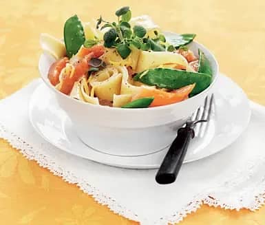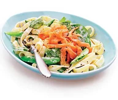 Citronpappardelle med rökt lax och sockerärter
