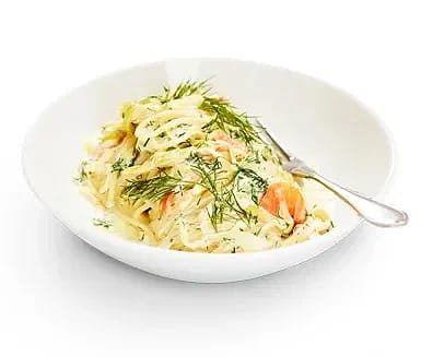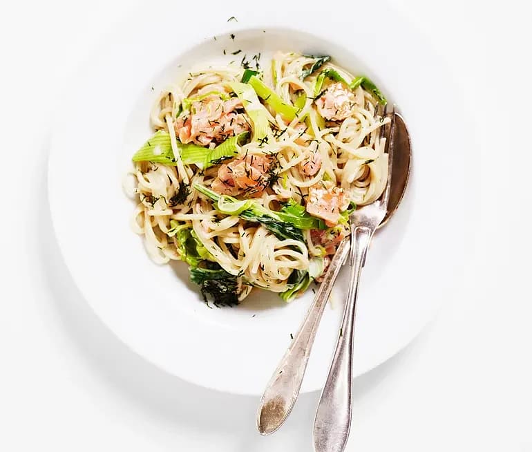 Spagetti med rökt lax, purjolök, dill och citron