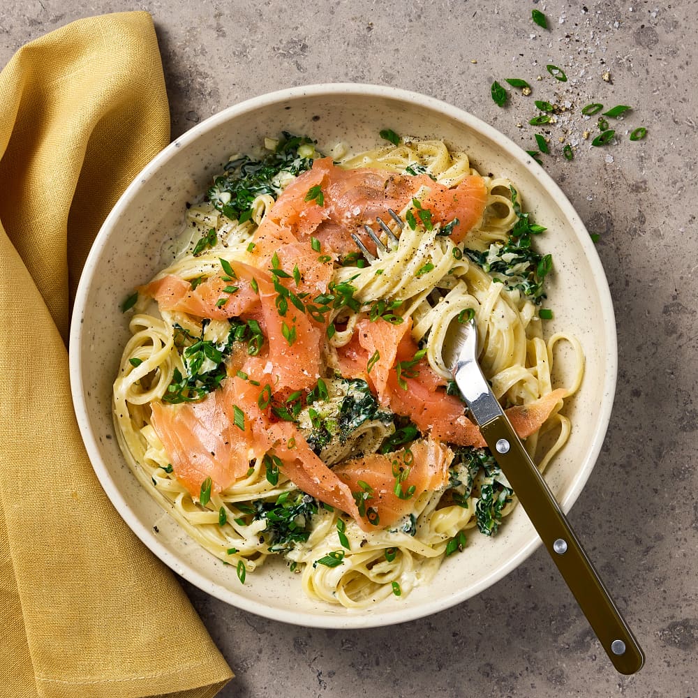 Pasta med spenat, mascarpone och rökt lax