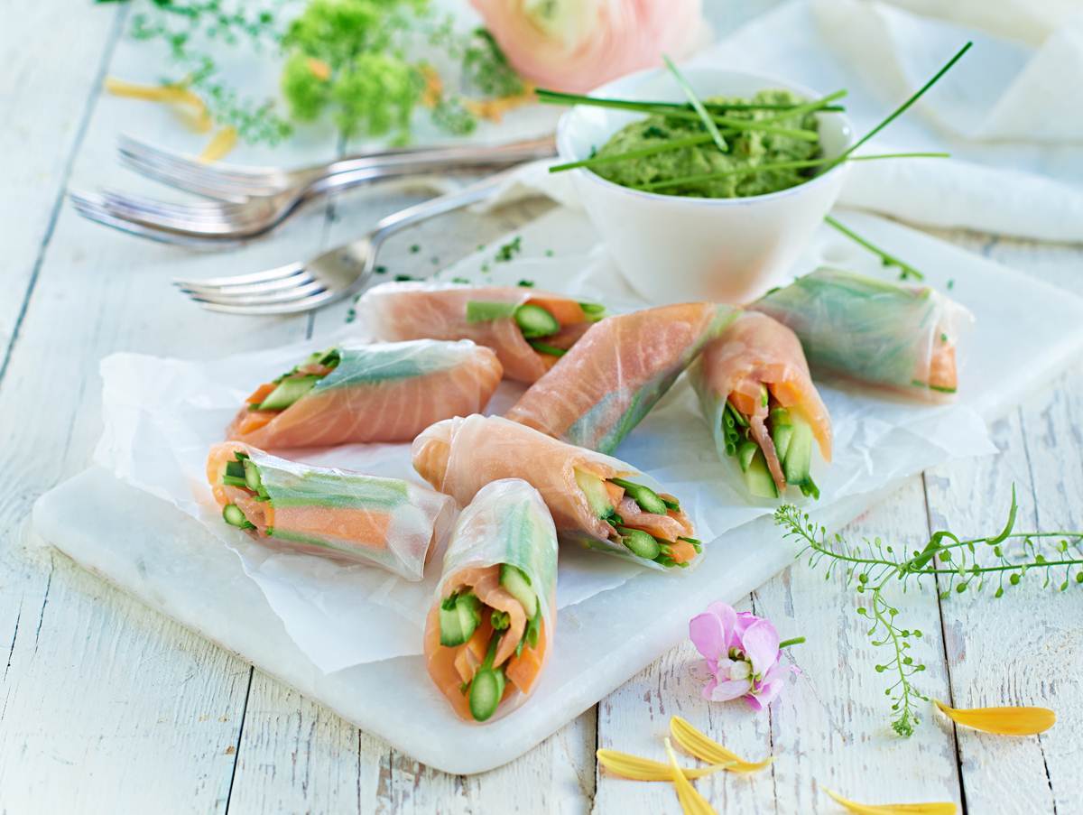 Sommarrullar med rökt lax och pepparrotsdipp