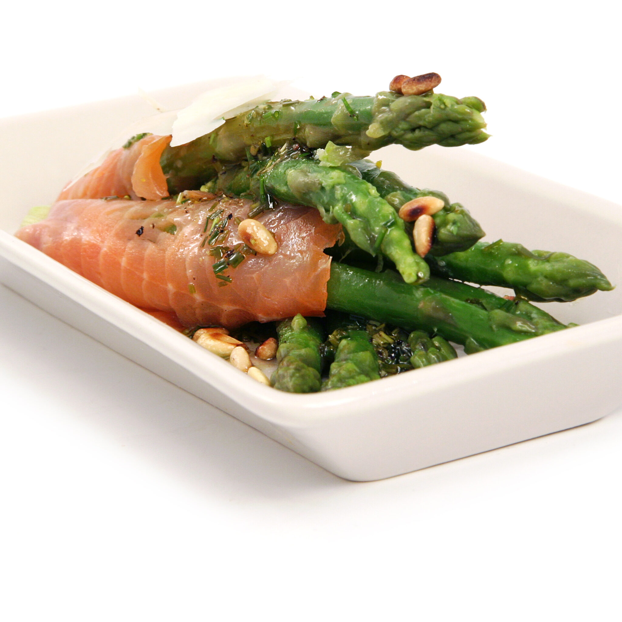 Citrondoftande färsk grön sparris med rökt lax och rostade pinjenötter