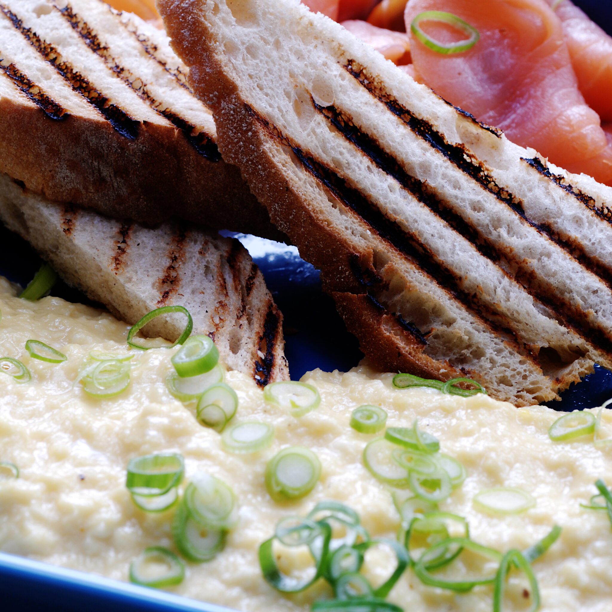 Äggröra med rökt lax och grön sparris på bondbröd