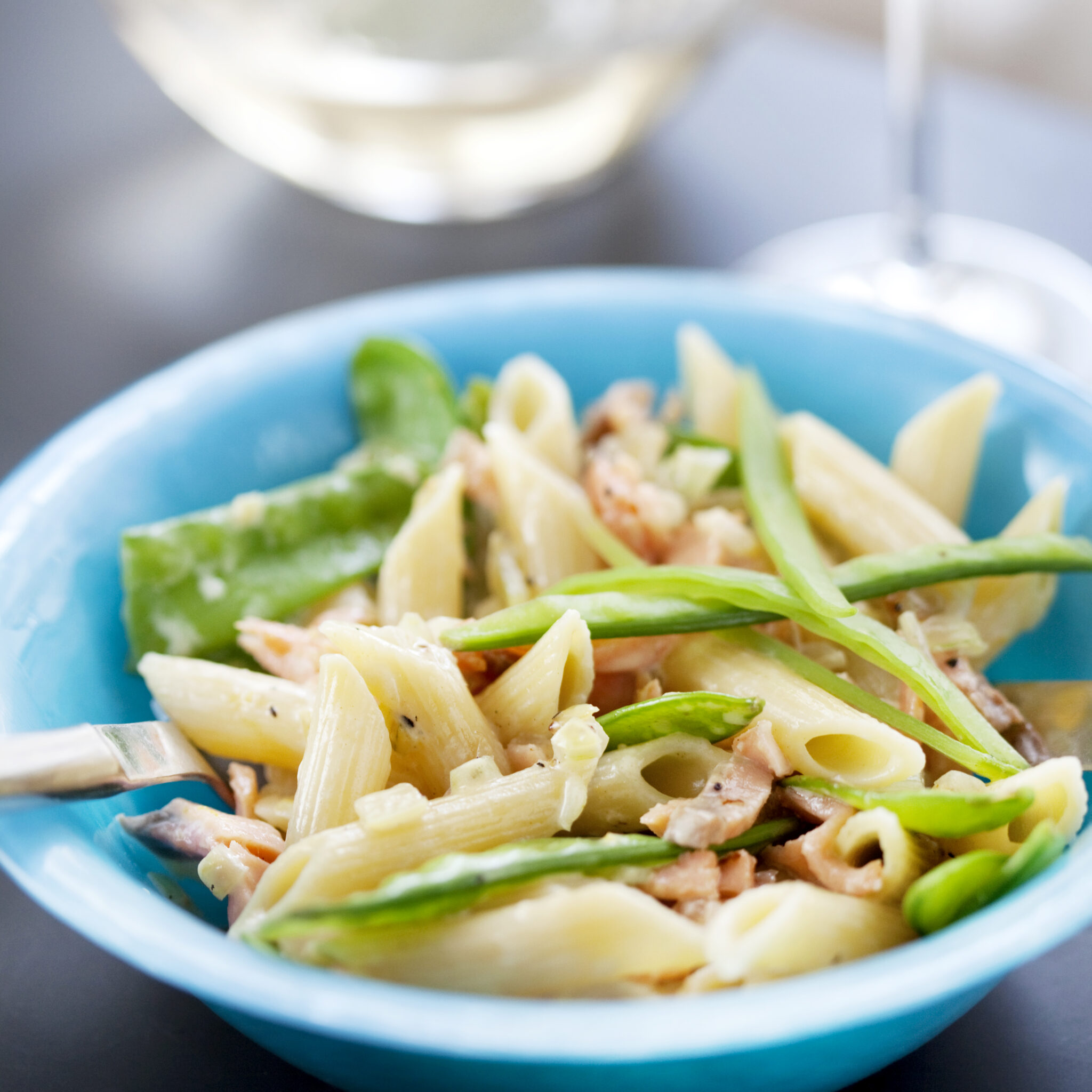 Citronpenne med rökt lax och sockerärter