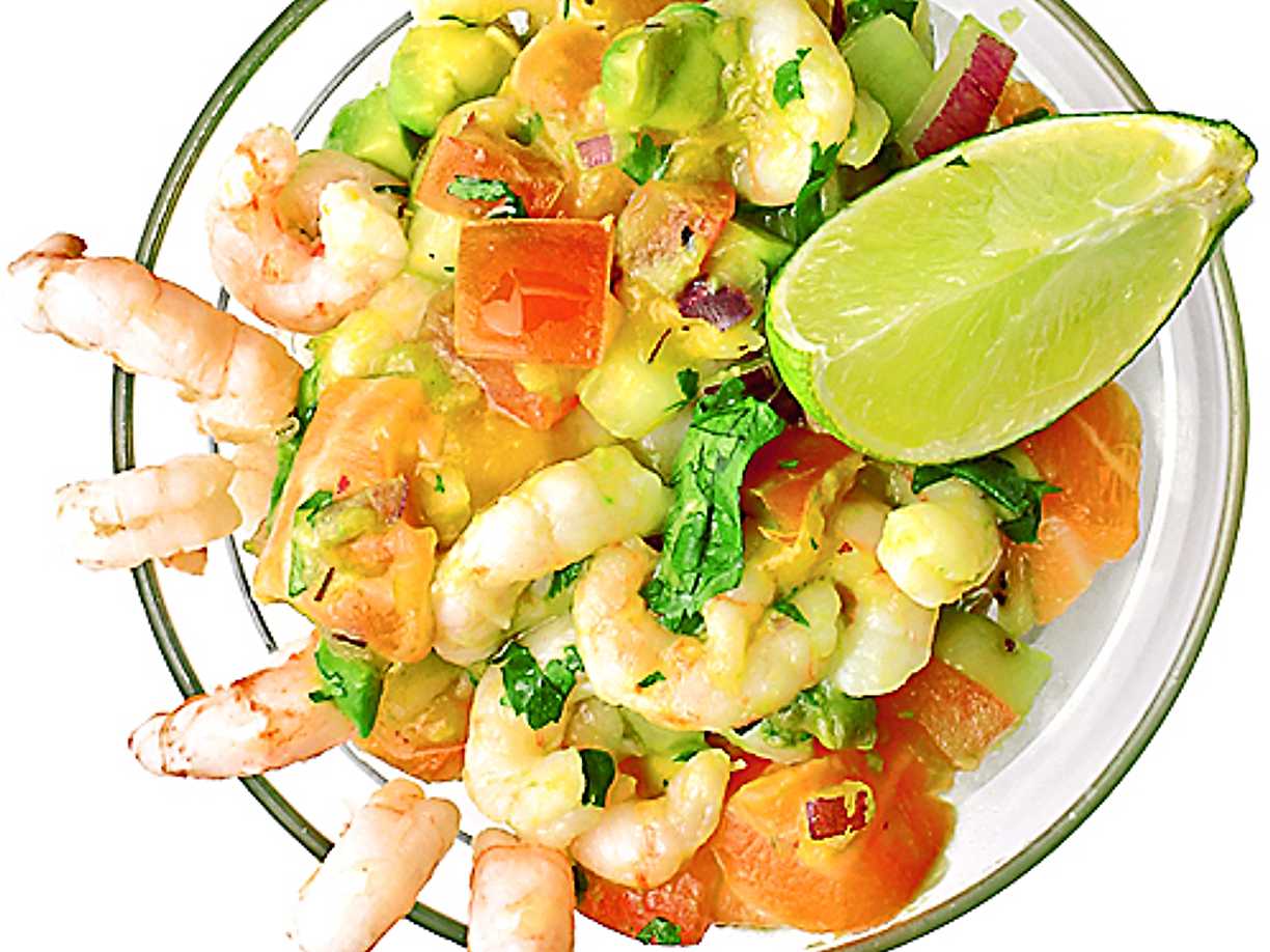 Kall avokadosoppa med rökt lax och räkor