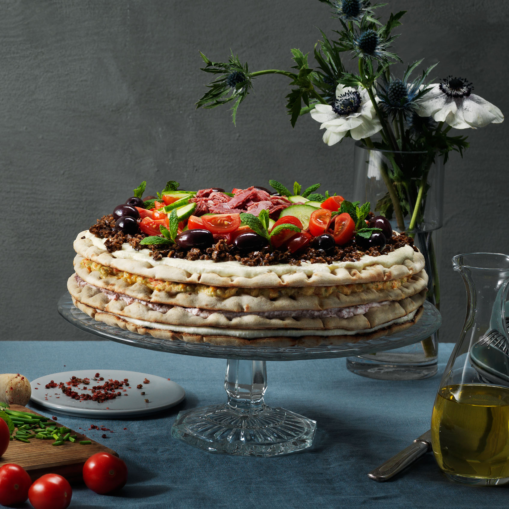 Smörgåstårta med rökt lax, avokado och hyvlad fänkål