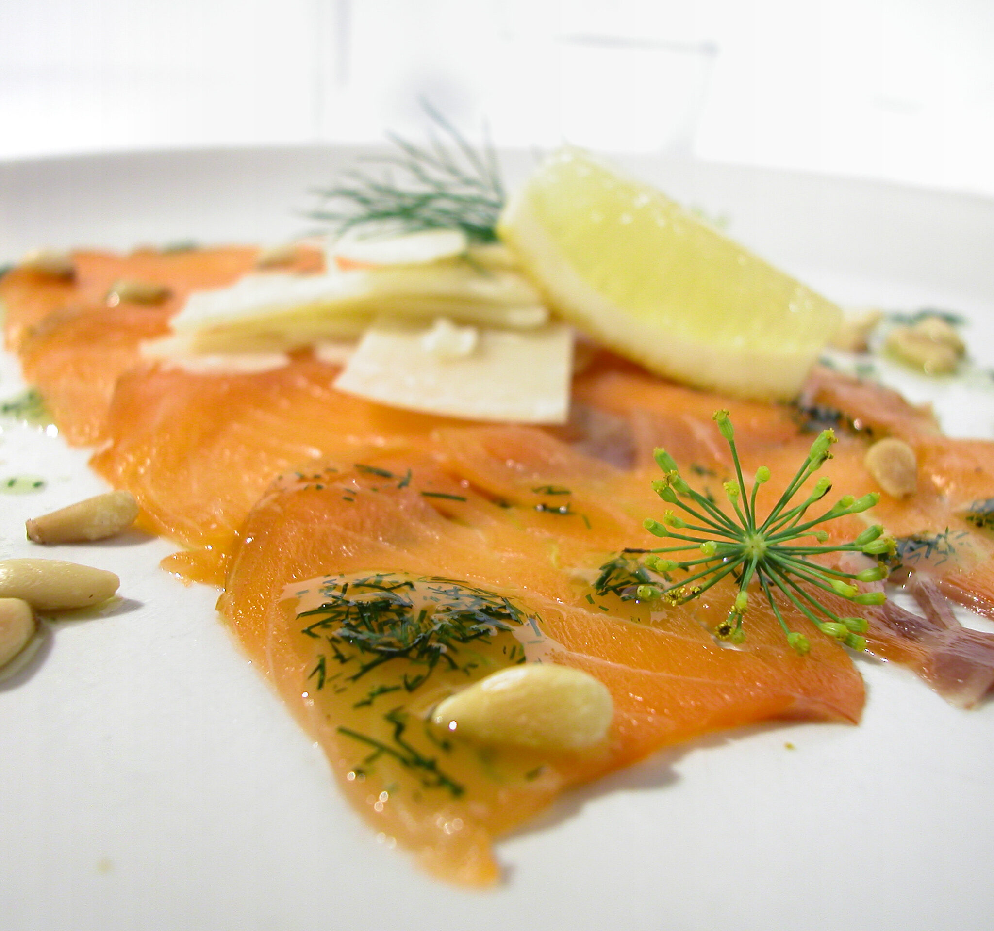 Rökt laxcarpaccio med pinjenötter, parmesanost och dillolja