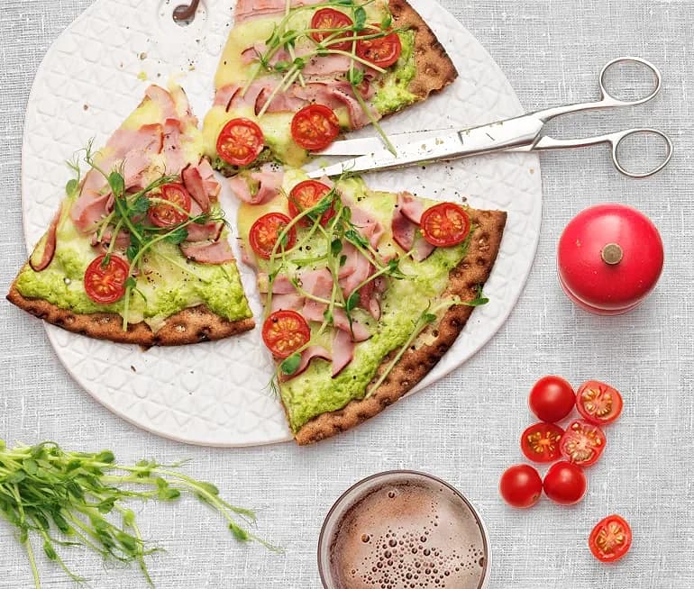 Knäckebrödspizza med ärtcrème, rökt skinka och västerbottensost.