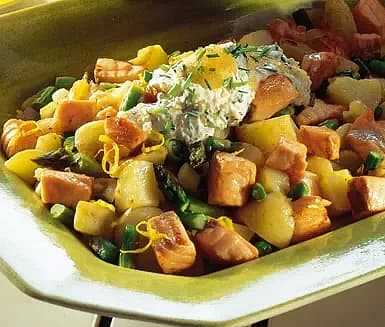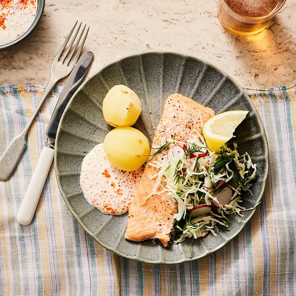 Stekt lax med dill- och pepparrotsslungad potatis och romsås