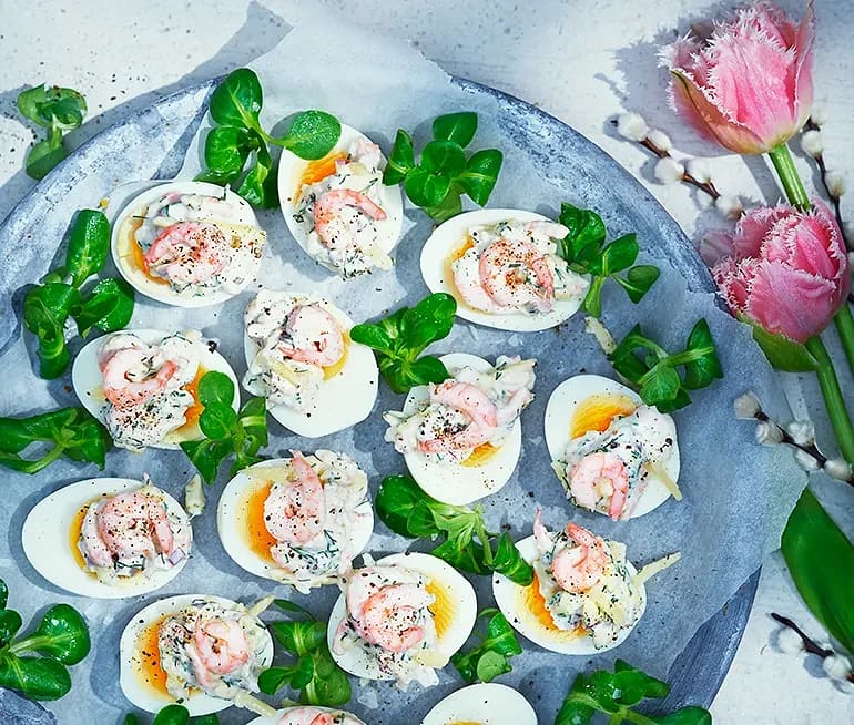 Ägghalvor med räk- och oströra