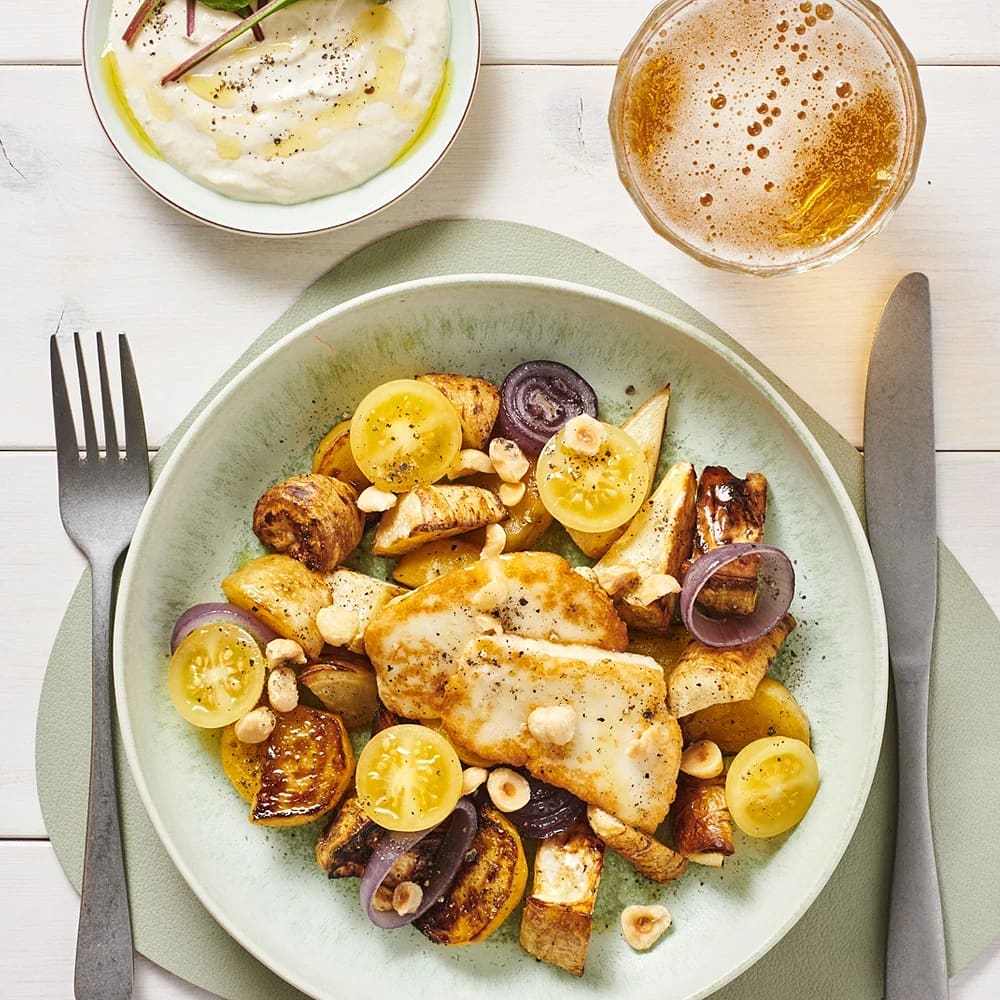Gulbetor med halloumi och krämig hummus