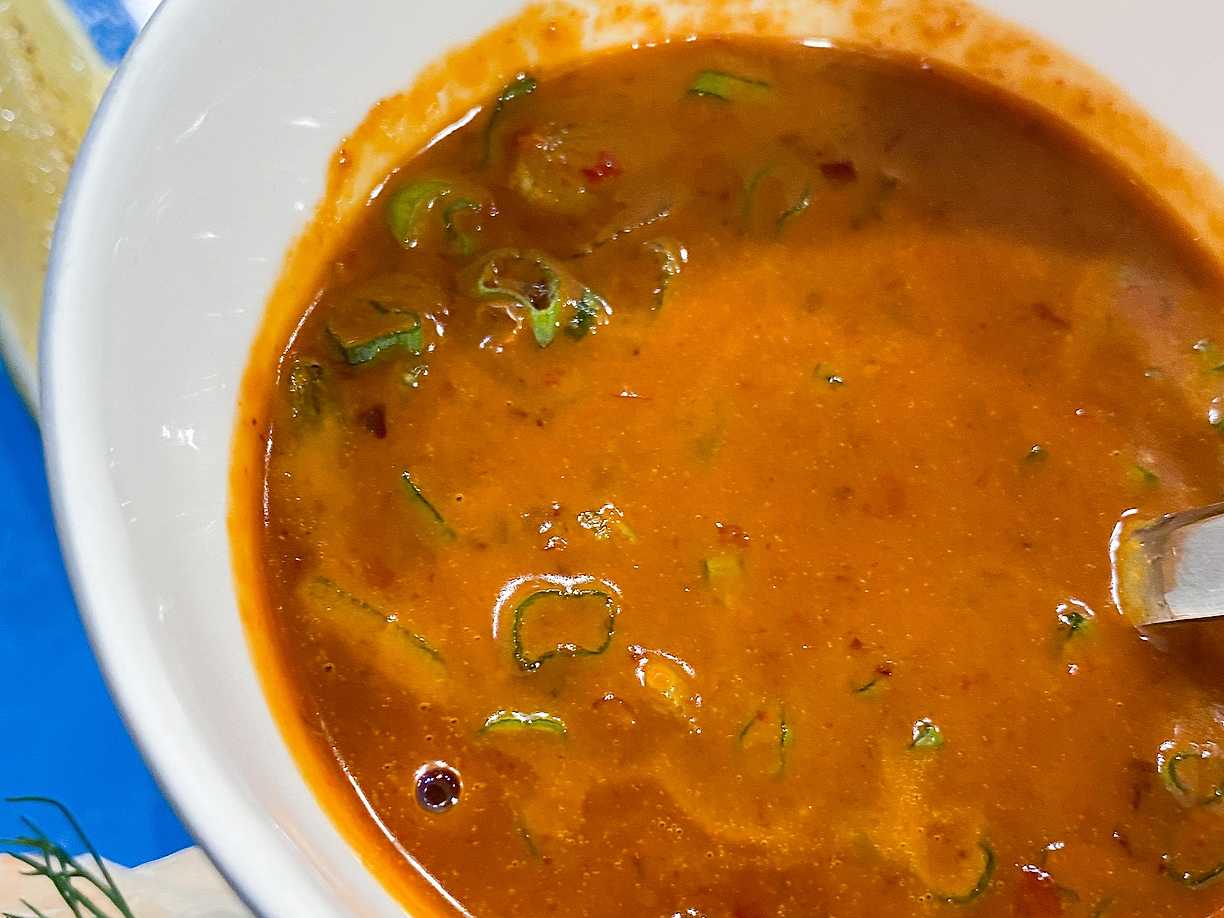 Röd linssoppa och mackor med hummus