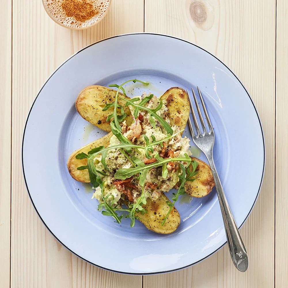 Bakad potatis med oströra, bacon och jalapeño