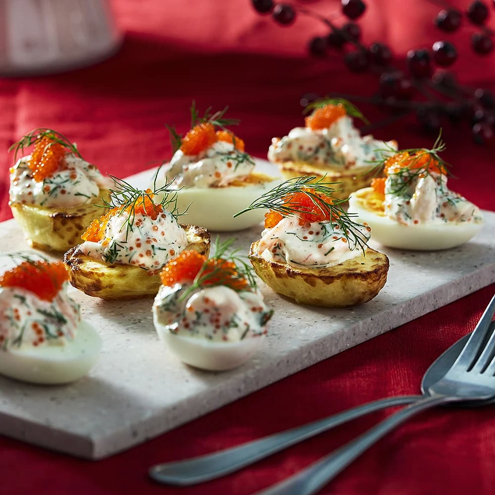 Ägg- och potatishalvor med räk- och tångröra