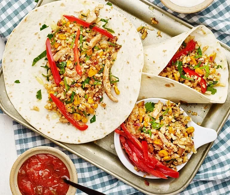 Fajitas med rostad majs, blomkålsris och kyckling