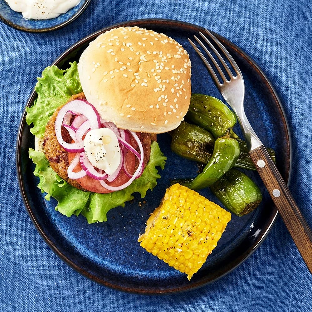 Bönburgare i bröd med pimiento de padron och rostad majs