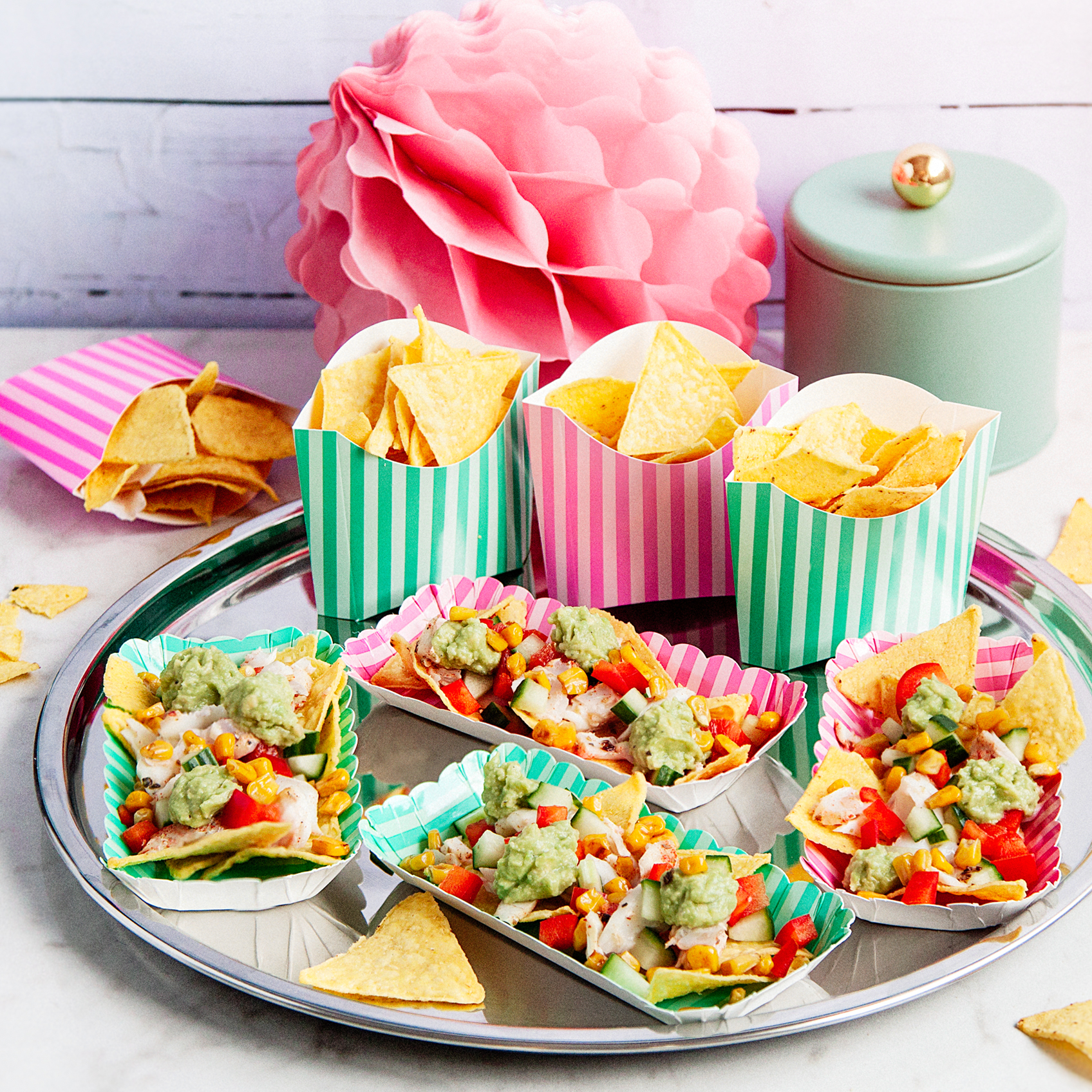 Fish taco med tomatsalsa, rostad majs och guacamole