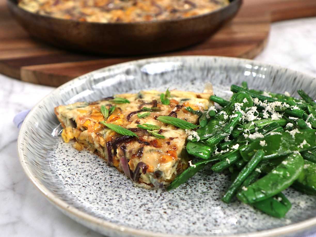 Omelett med rostad majs och grön ärtsallad