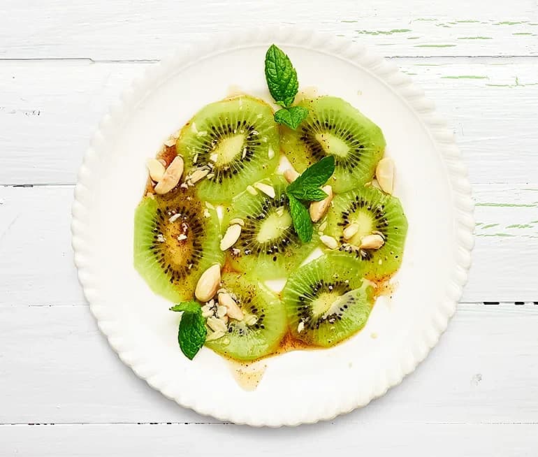 Kiwicarpaccio med rostad mandel och mynta