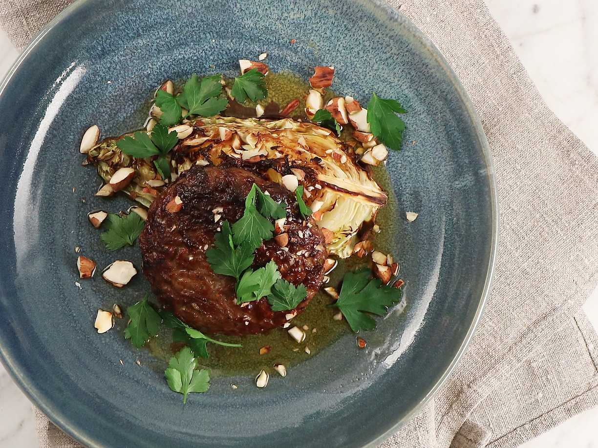 Saftiga högrevsbiffar med ugnsbakad kål och rostad mandel