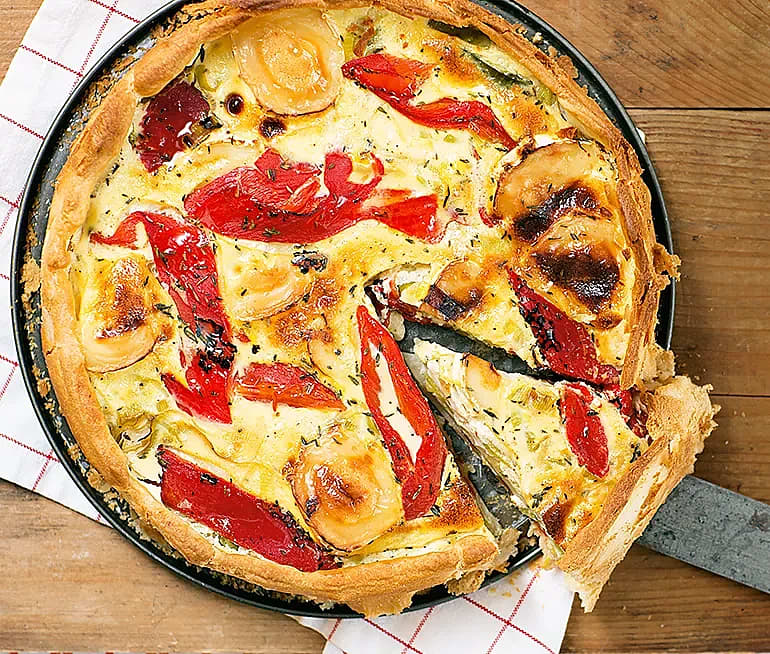 Pizza med rostad paprika, fetaost, prosciutto och oregano