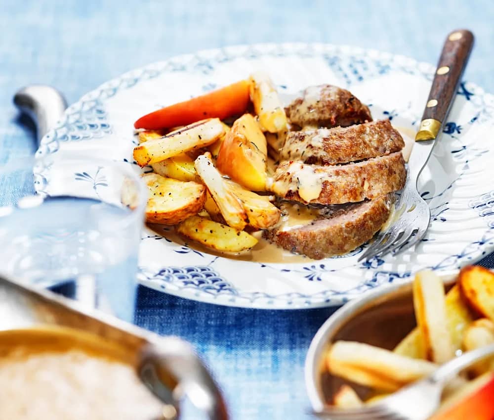 Helstekt fläskytterfilé med rostade rotfrukter och färskostsmör