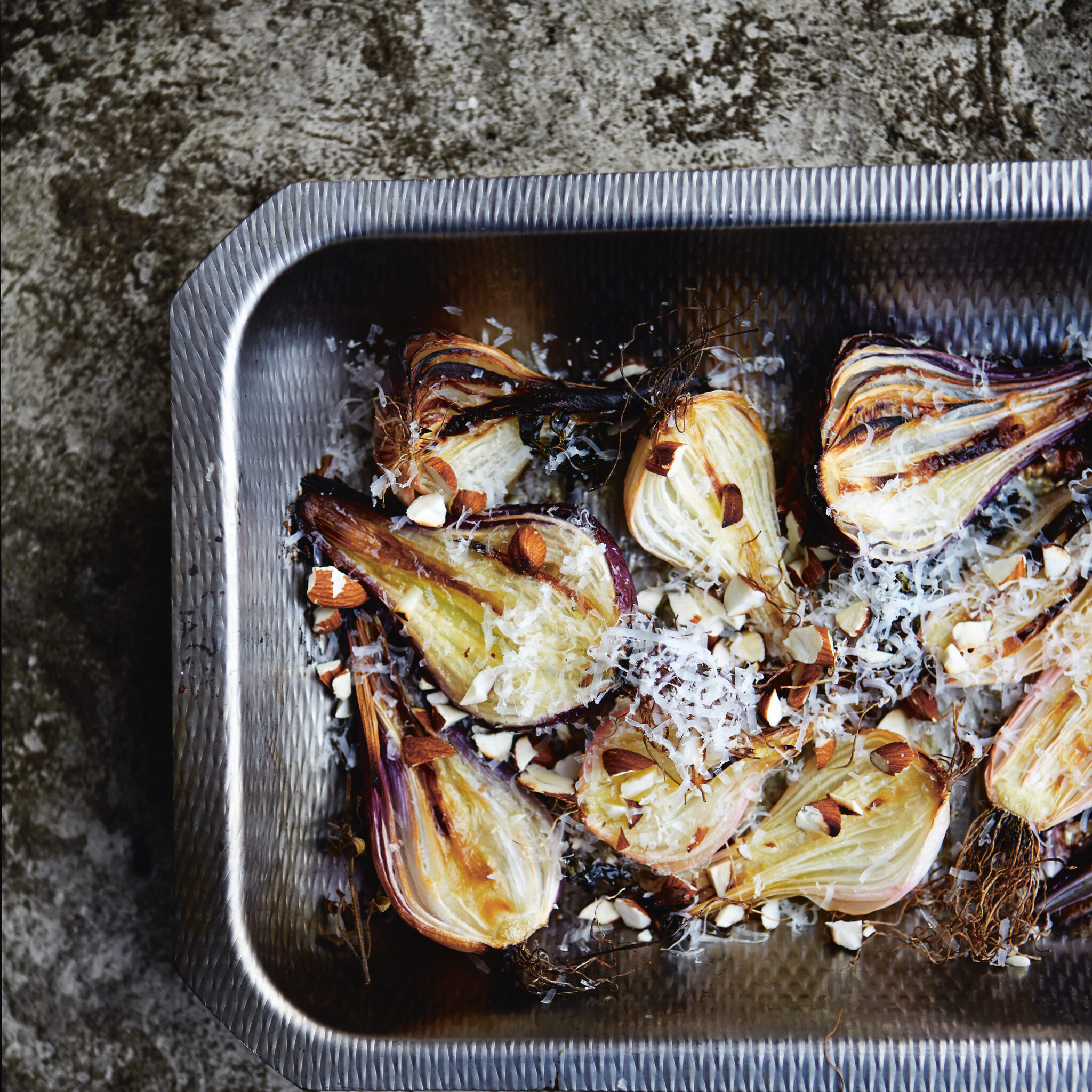 Ugnsbakade lökar med gryère och rostade hasselnötter