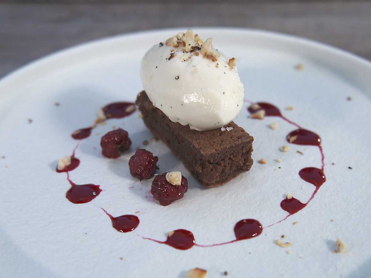 Chokladbrownie med vaniljglass, åkerbärscouli och rostade hasselnötter