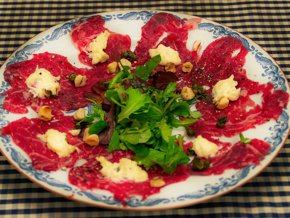 Carpaccio med prästostkräm och rostade hasselnötter