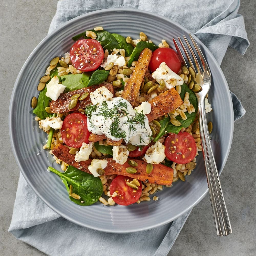 Rostade morötter med garam masala, fetaost och dillyoghurt