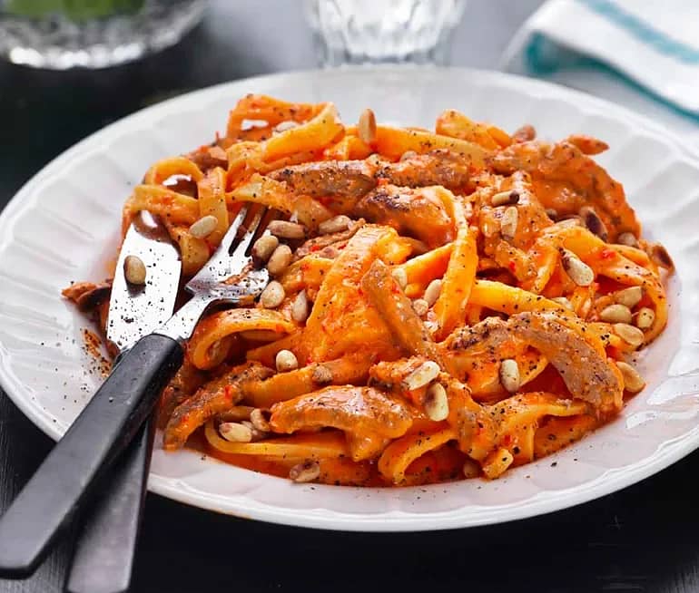 Pasta med paprikasås, fläskfilé och rostade pinjenötter