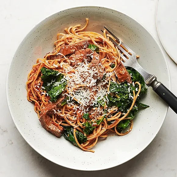 Bönpasta med röd pesto, rostbiff och grönkål