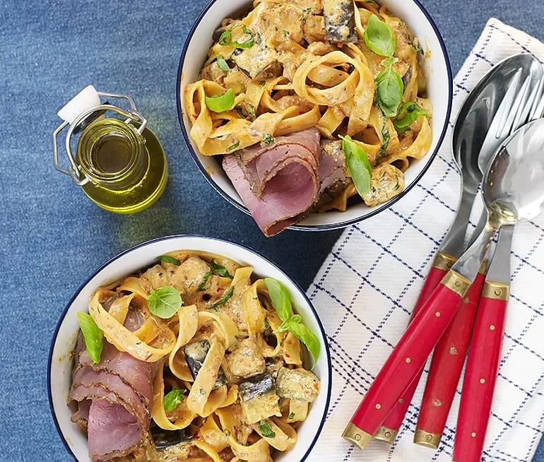 Auberginepasta med rostbiff
