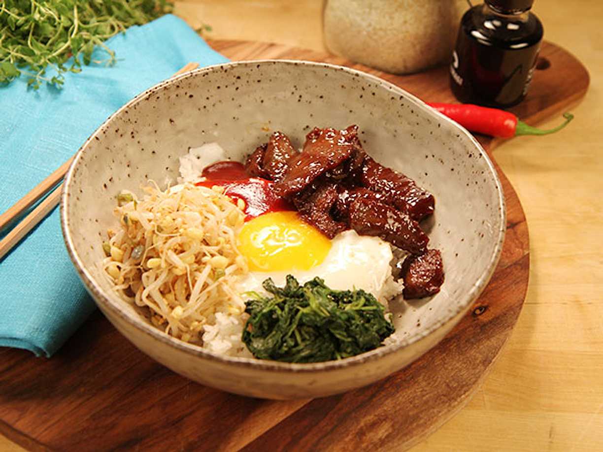 Bibimbap med ris, rostbiff och stekt ägg