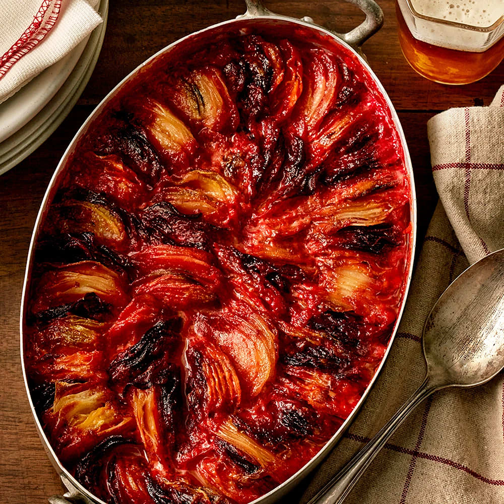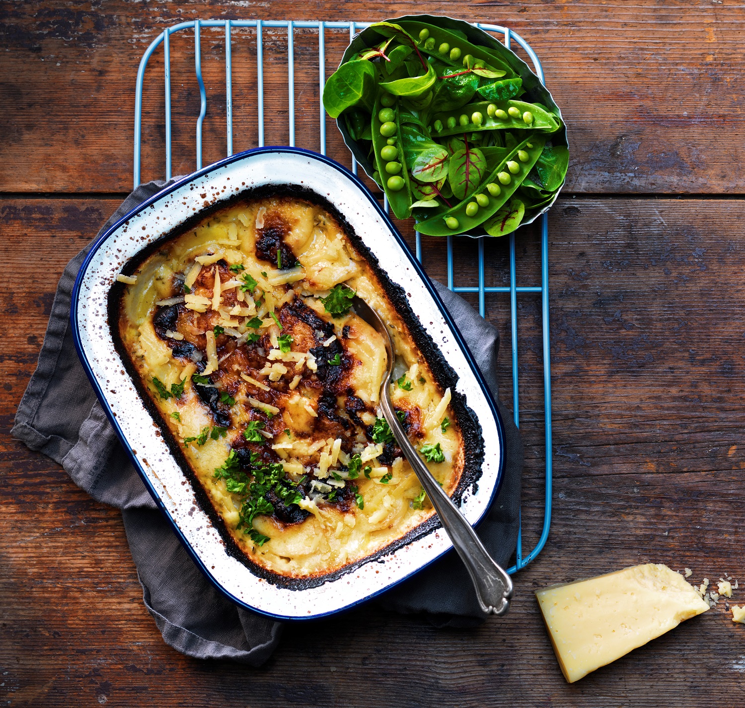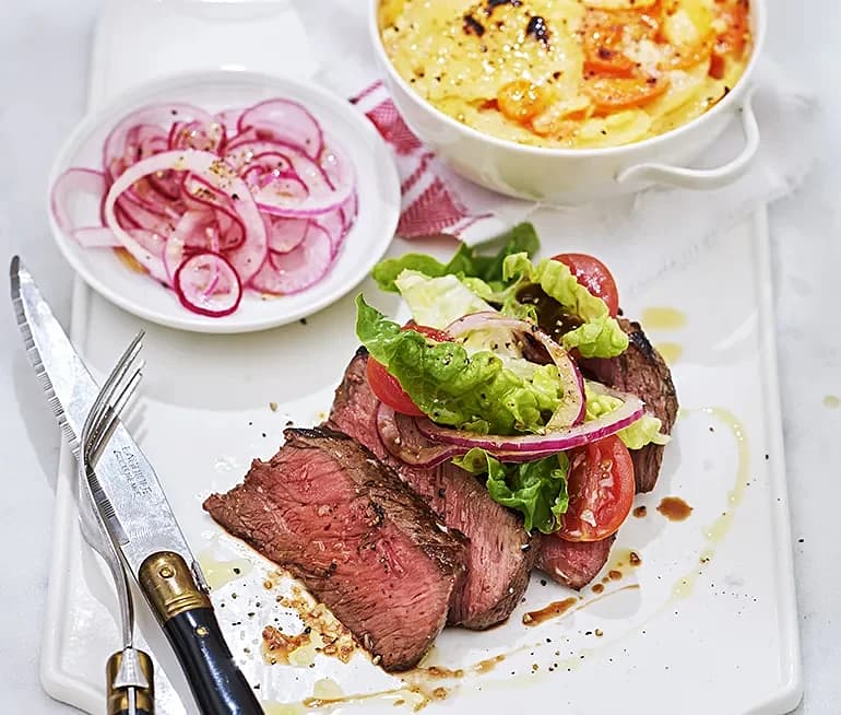 Pepparstekt rostas, rotfruktsgratäng och picklad rödlök
