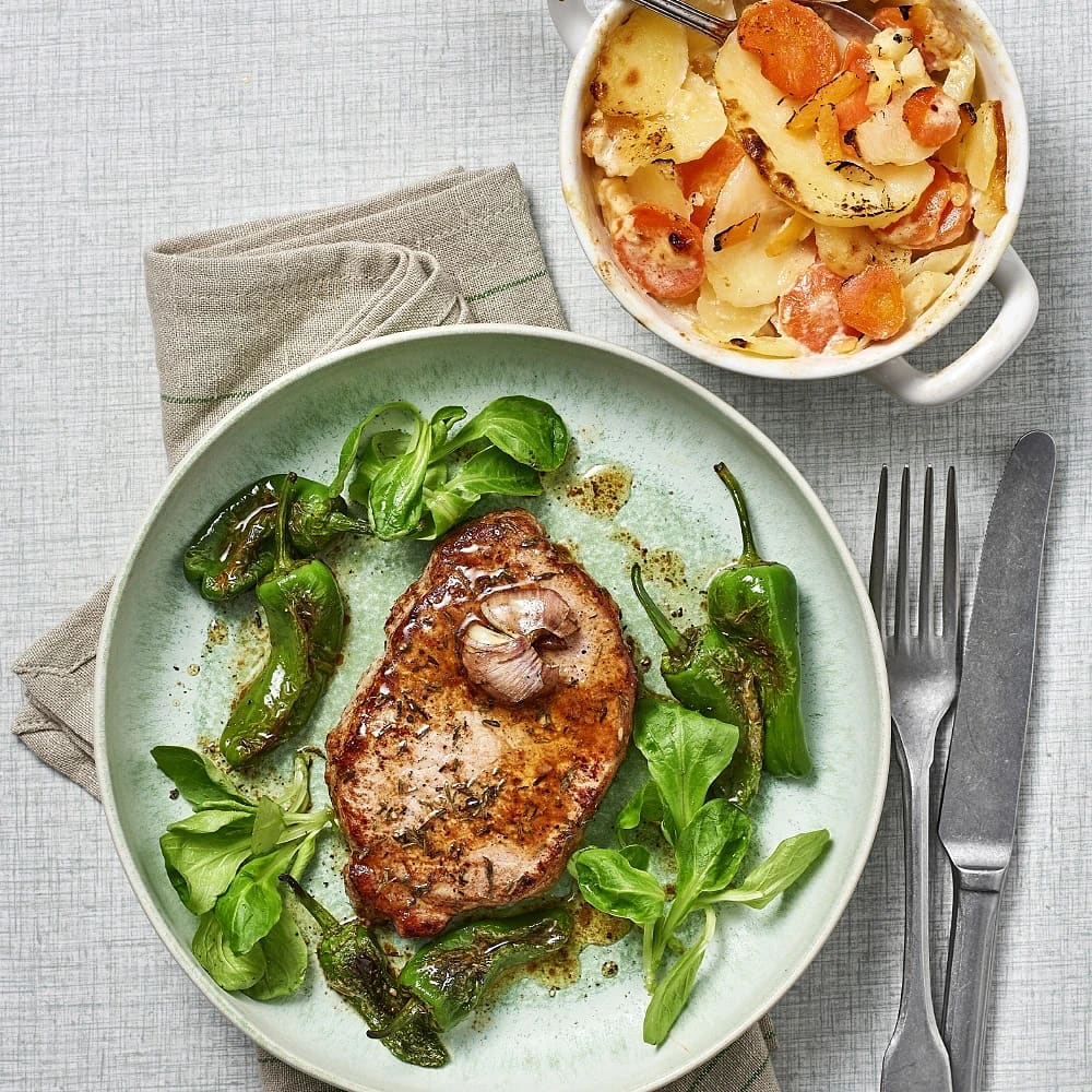Kotlett med rotfruktsgratäng och pimiento de padron