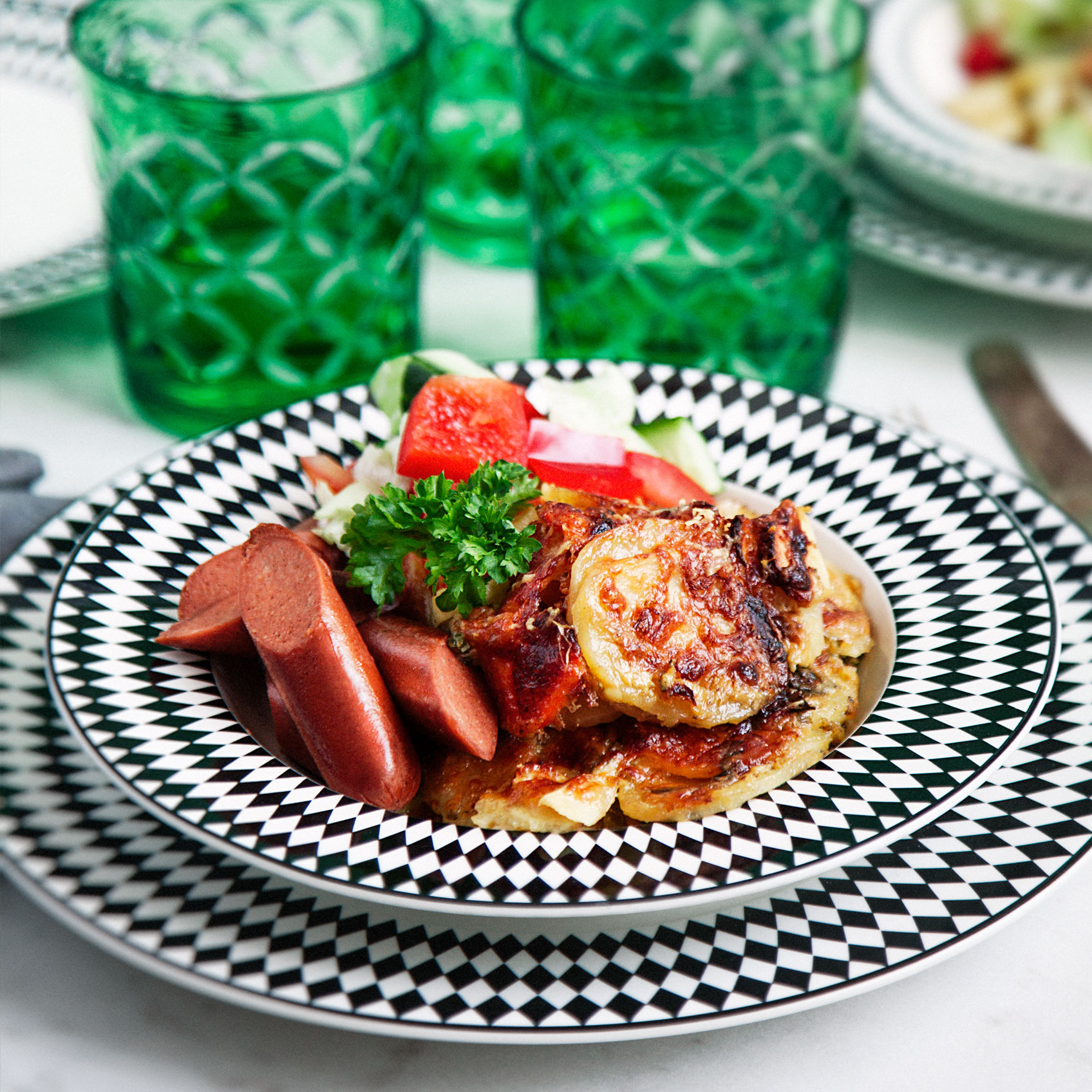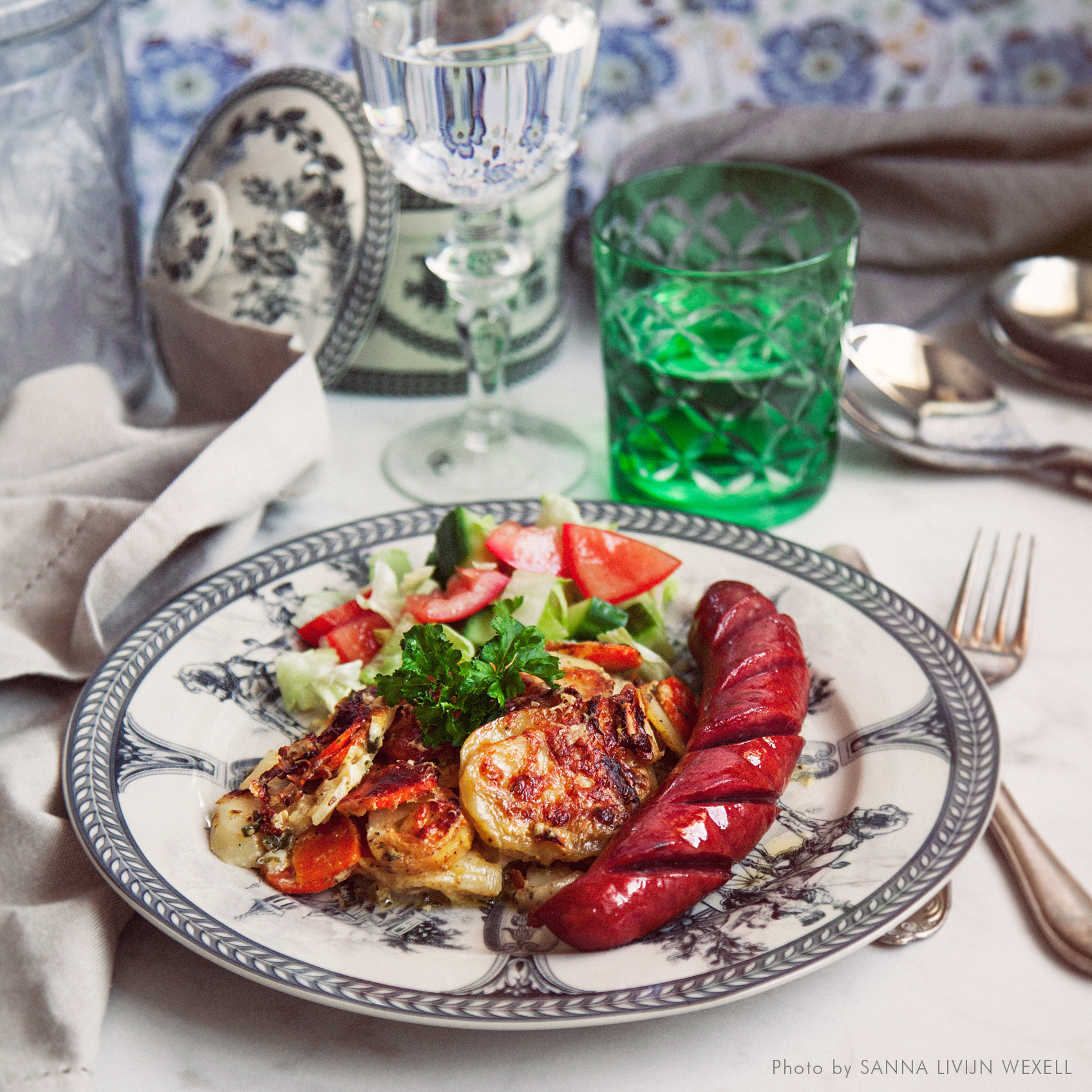 Grillat lamm med rotfruktsgratäng och rödvinssky