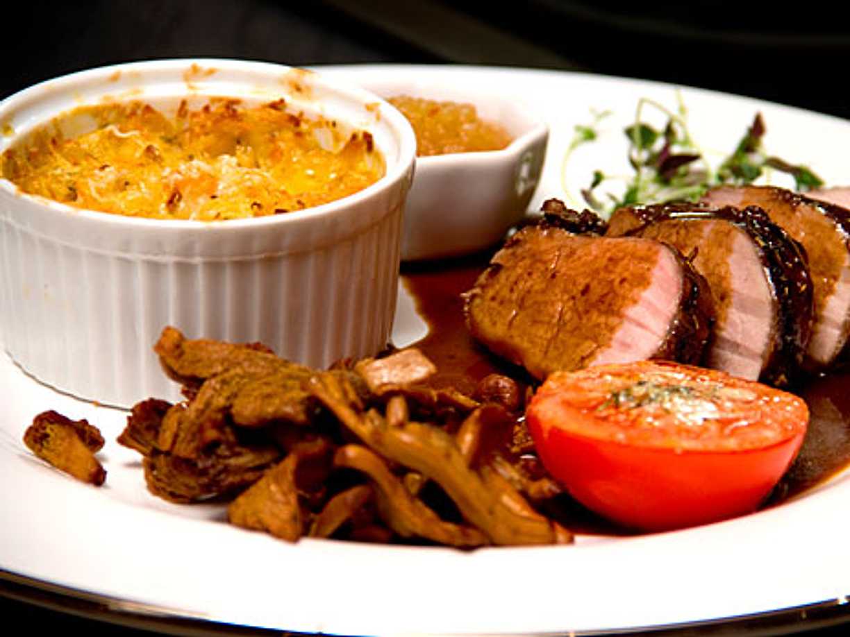 Ryggbiff med rotfruktsgratäng och pepparsås